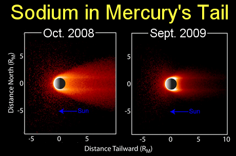 Merkür'ün kuyruğundaki kırmızı bölge, sodyum atomlarından oluşmakta. Bu bilgi MESSENGER uzay aracı üzerinde bulunan spektrometre tarafından belirlenmekte.