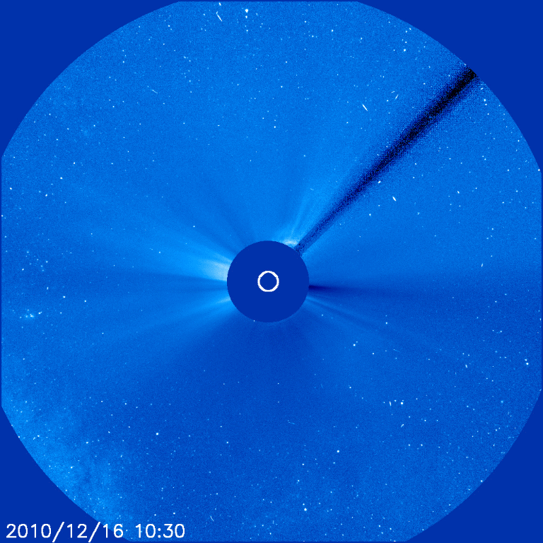Yukarıdaki görüntüde 16 Aralık 2010 tarihinde gerçekleşen Koronal Kütle Atımı (CME) gözleniyor.